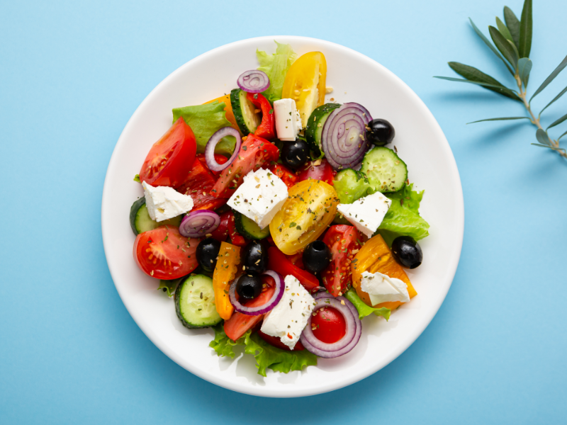 Serviert mit grünem Salat und Tzatziki